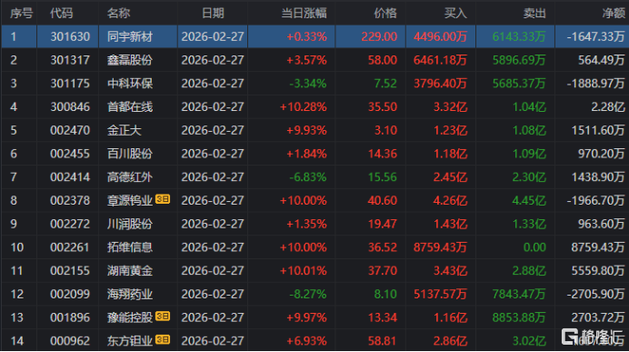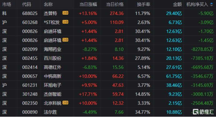 龙虎榜中涉及机构专用席位的个股中,当日净卖出额前三为启迪环境、海翔药业、百川股份,分别为1.7亿元、8278.85万元、7385.18万元。