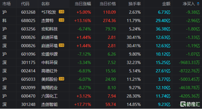 龙虎榜单日净卖出额前三为宏和科技、启迪环境、宏盛华源,分别为1.8亿元、1.33亿元、1.07亿元。