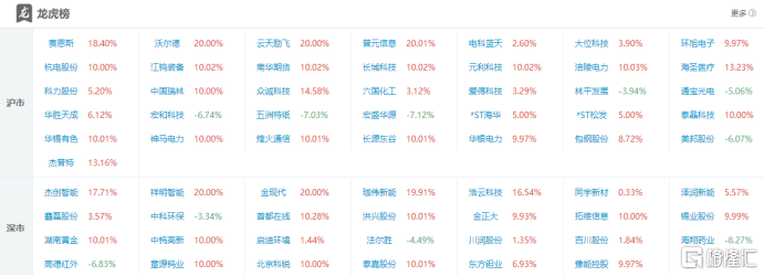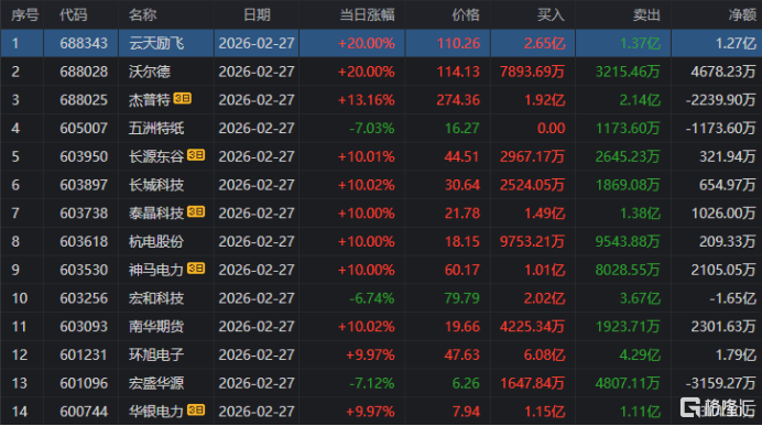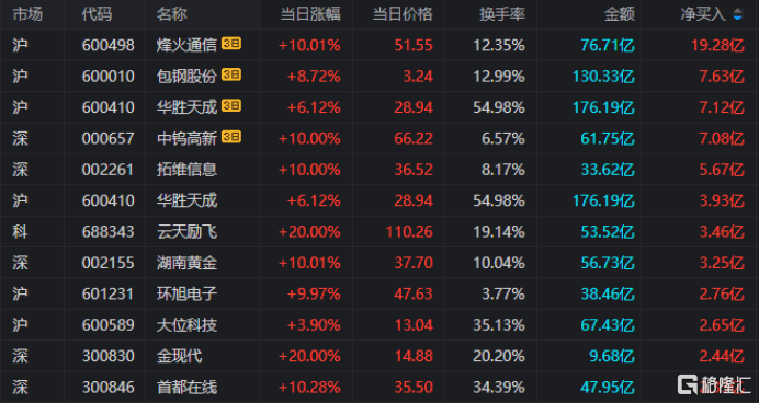 龙虎榜单日净买入额前三为拓维信息、华胜天成、云天励飞,分别为5.67亿元、3.93亿元、3.46亿元。