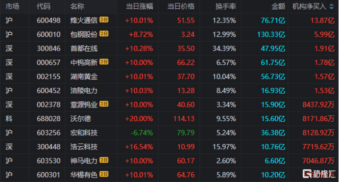 龙虎榜中涉及机构专用席位的个股中,当日净买入额前三为首都在线、湖南黄金、涪陵电力,分别为1.91亿元、1.57亿元、1.53亿元。