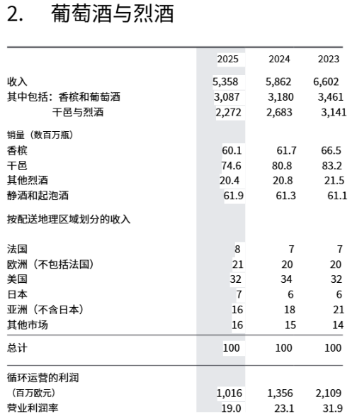 葡萄酒与烈酒部门则是集团收入承压最为突出的业务部门。该业务全年实现营收53.58亿欧元,同比下降9%,有机增长率为-5%。而在盈利能力方面,该业务的经常性业务利润为10.16 亿欧元,较上年同期锐减25%,其营业利润率已从2023年的31.9%下滑至2025年的19%。