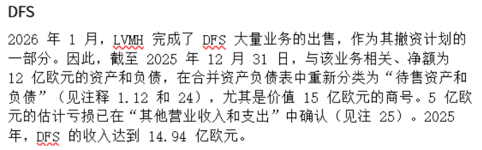 在此趋势下,LVMH却同步进行着一项耐人寻味的资产处置。2026年1月,LVMH与中国中免签署协议,将DFS位于香港、澳门等大中华区的业务及门店出售。财报显示,LVMH将与该业务相关的净资产账面价值12亿欧元的资产和负债归类为“待售”,并提前确认了5亿欧元的出售亏损,这直接导致了2025年减值费用的大幅增加。虽然这是一次性资产处置,但也一定程度拉低了当年的账面利润。