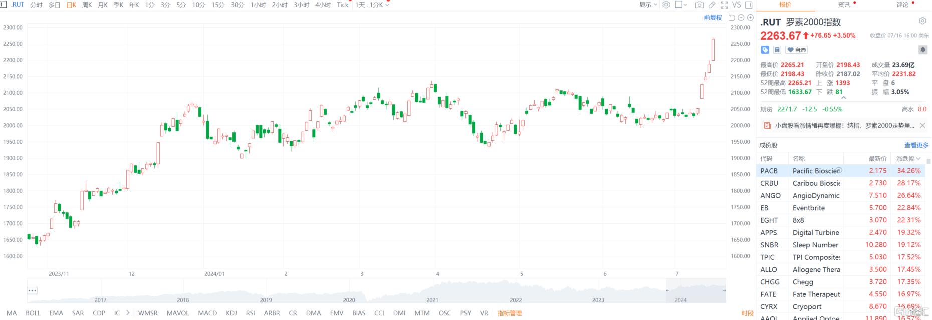 由于押注降息交易叠加特朗普交易,隔夜,以小盘股为主的罗素2000指数大涨3%,报2263.67点,创下2022年1月以来的最高水平。
