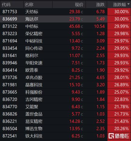 截至发稿,海达尔、天纺标、荣亿精密、中裕科技、中纺标、同心传动、格利尔、华阳变速、欧普泰30CM涨停,卓兆点胶、晶赛科技、易实精密、科强股份、盖世食品、吉冈精密、艾能聚、博讯生物涨超20%。