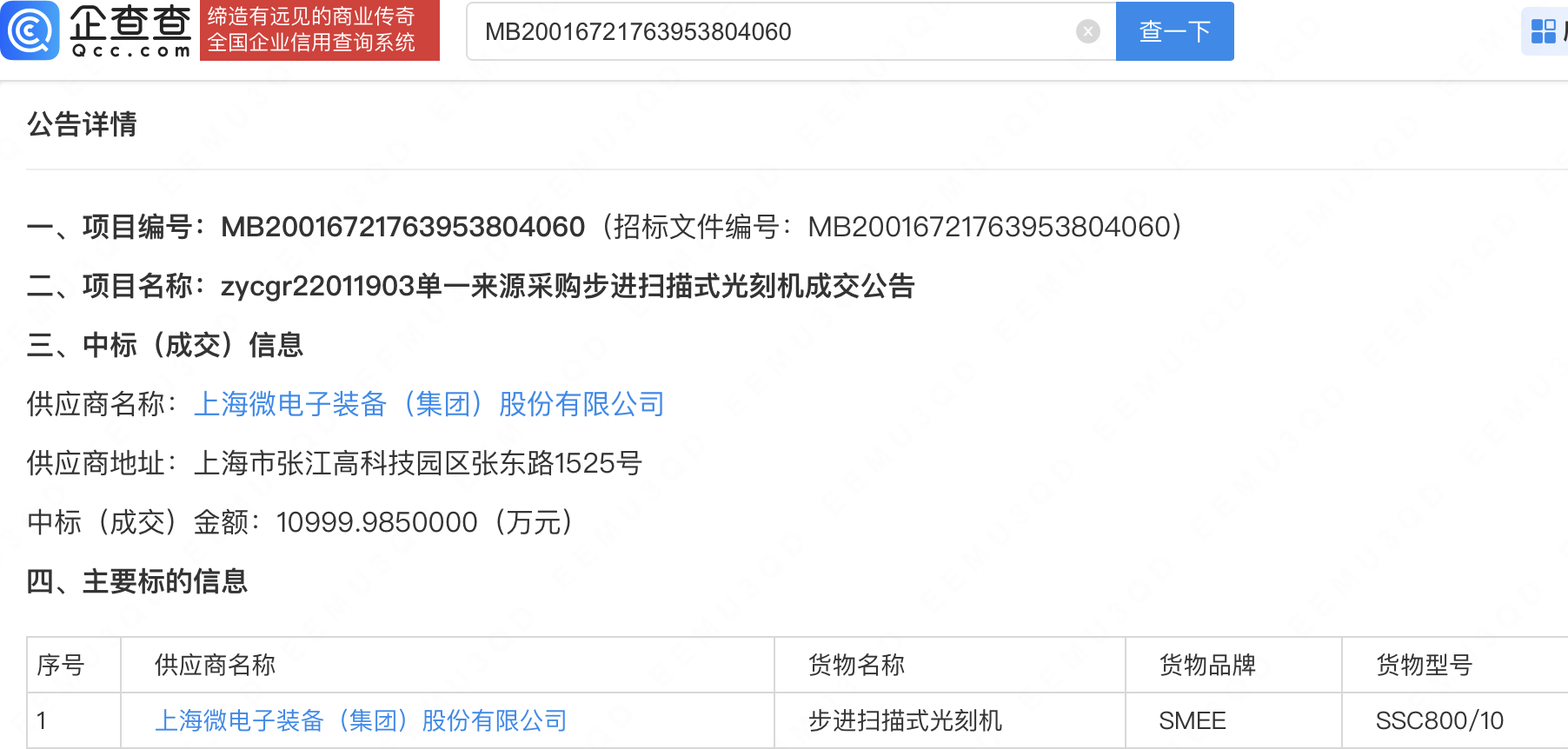 企查查APP显示,近日,上海微电子装备(集团)股份有限公司中标步进扫描式光刻机项目,中标金额约1.09亿元。据此前公告,招标方为科学技术部。企查查信息显示,该公司成立于2002年,经营范围包含:半导体装备、泛半导体装备、高端智能装备的开发、设计、制造、销售及技术服务等,由上海电气控股集团有限公司、张江高科(600895)全资子公司上海张江浩成创业投资有限公司等共同持股。