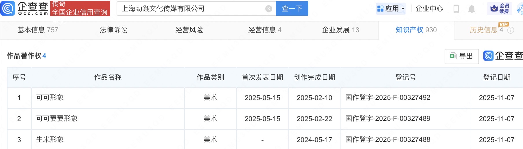 企查查APP显示,近日,上海劲焱文化传媒有限公司登记“可可嫑嫑形象”“可可形象”“生米形象”作品著作权,作品类别均为美术。该公司经营范围包括演出经纪、营业性演出等,由周深、张铭共同持股。