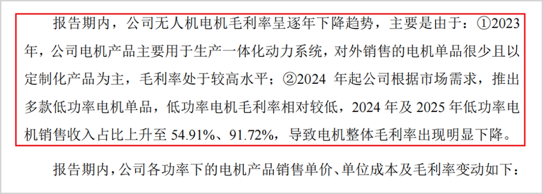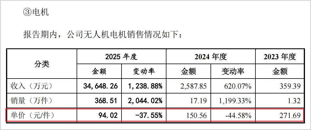 公司的核心产品无人机电机销售单价从2023年的271.69元大幅跌至2025年的94.02元,降幅超过65%。降价虽然带来了销量的快速增长,但也影响了盈利质量。