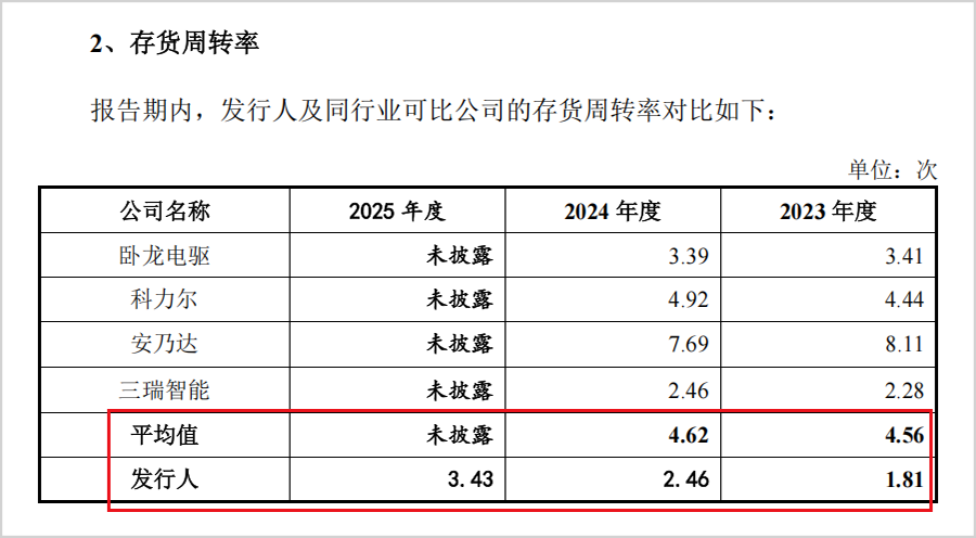 “以价换量”策略的实施还带来了其他财务指标的承压。公司存货金额连年走高,从2023年的1.37亿元增至2025年末的3.36亿元,增幅达到145.3%,存货周转率均低于已披露的同业可比公司,显示出存货管理效率与消化能力可能存在问题。