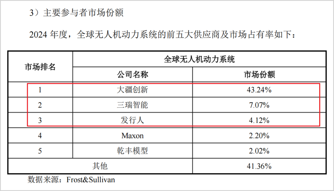 根据弗若斯特沙利文的数据,2024年大疆创新在全球民用无人机电动动力系统市场的占有率为43.24%,稳居全球第一,三瑞智能以7.07%的比例位居第二。对于好盈科技而言,虽然在第三方供应商中属于第一梯队,但4.12%的全球市场占有率在整个行业生态中仍显得相对薄弱。这种市场格局意味着,好盈科技的主要生存空间被挤压在除行业巨头自研体系之外的有限市场内。