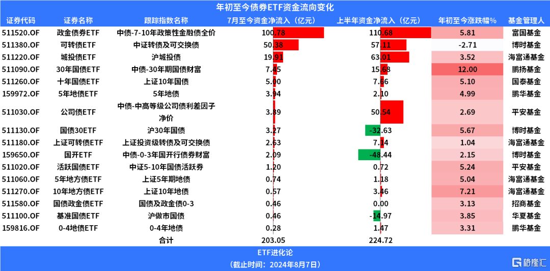从今年上半年和7月1日-8月7日两个区间段观察今年资金对债券ETF的配置,可以看出7月以来资金更加狂热买入。