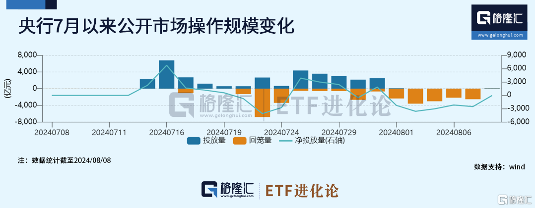 一是央行逆回购回归“地量”操作,每日投放量从跨月前的千亿级别到8月7日甚至出现零操作。截至8月8日,央行已经连续6个交易日回收过剩资金,净回笼超万亿元。