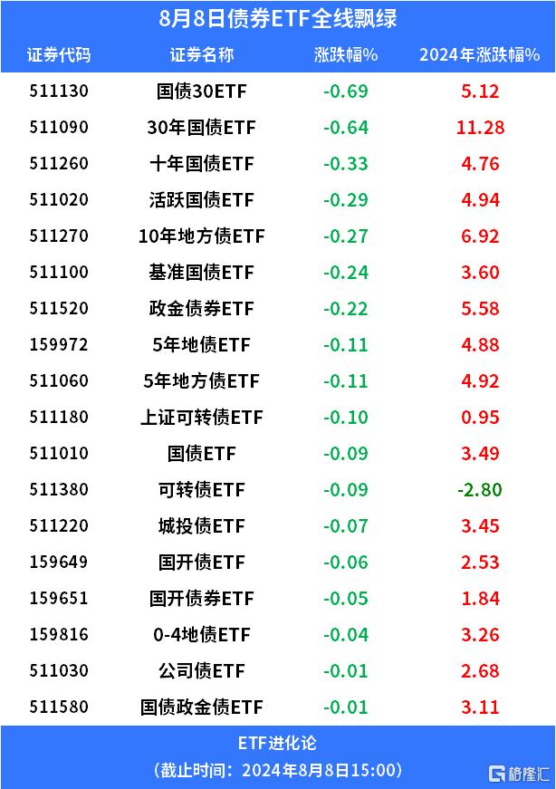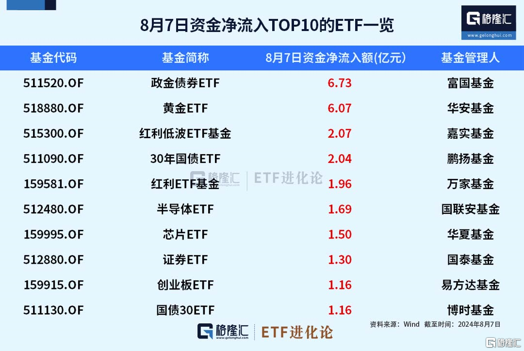 ETF资金同样买入债券ETF,富国基金政金债券ETF、鹏扬基金30年国债ETF、博时基金国债30ETF8月7日分别获资金净流入6.73亿元、2.04亿元和1.16亿元。