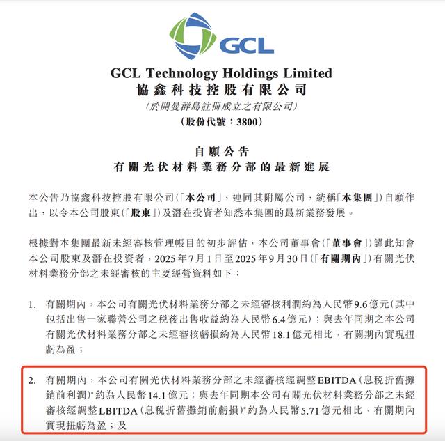 10月16日,协鑫科技发布了自愿公告,公司光伏材料业务在今年三季度扭亏为盈,未经审核利润为9.6亿元,较去年同期18.1亿元的亏损明显改善。