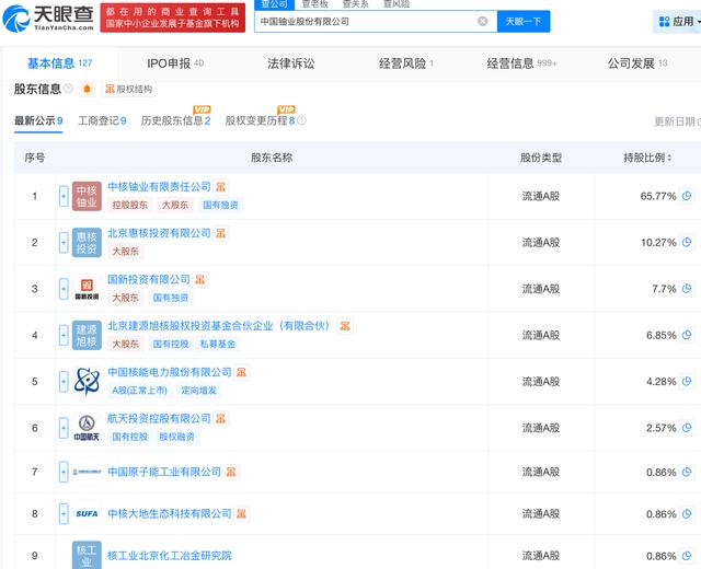 天眼查App信息显示,中国铀业成立于1989年5月,前身为中国核工业物资供销总公司。目前,该公司的注册资本为18.2亿元,法定代表人为袁旭,主要股东包括中核铀业、惠核投资、国新投资、旭核基金等。