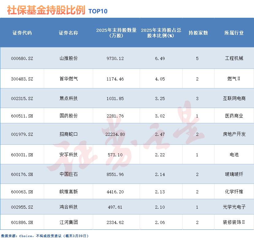 据Choice数据,截至3月20日,在已披露2025年年报的130余家A股公司中,社保基金的身影出现在了36家公司的前十大流通股股东名单之中,其最新的持仓结构呈现出“稳字当头、适度求进”的特点。