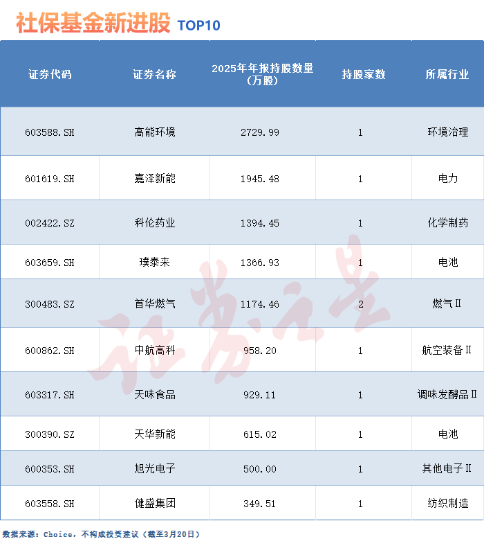 在新进个股中,高能环境的持股数量位居榜首。截至2025年末,社保基金持有近2730万股高能环境,为其第六大流通股股东。公司核心业务涵盖固废危废资源化利用、生活垃圾处理、环境修复等领域,同时兼顾固废危废无害化处置、水处理、大气污染治理、有机垃圾治理等多元业务。社保基金此时大举建仓,或许正是看中了其在土壤修复、危废处置等领域的技术壁垒及未来业绩释放的潜力。