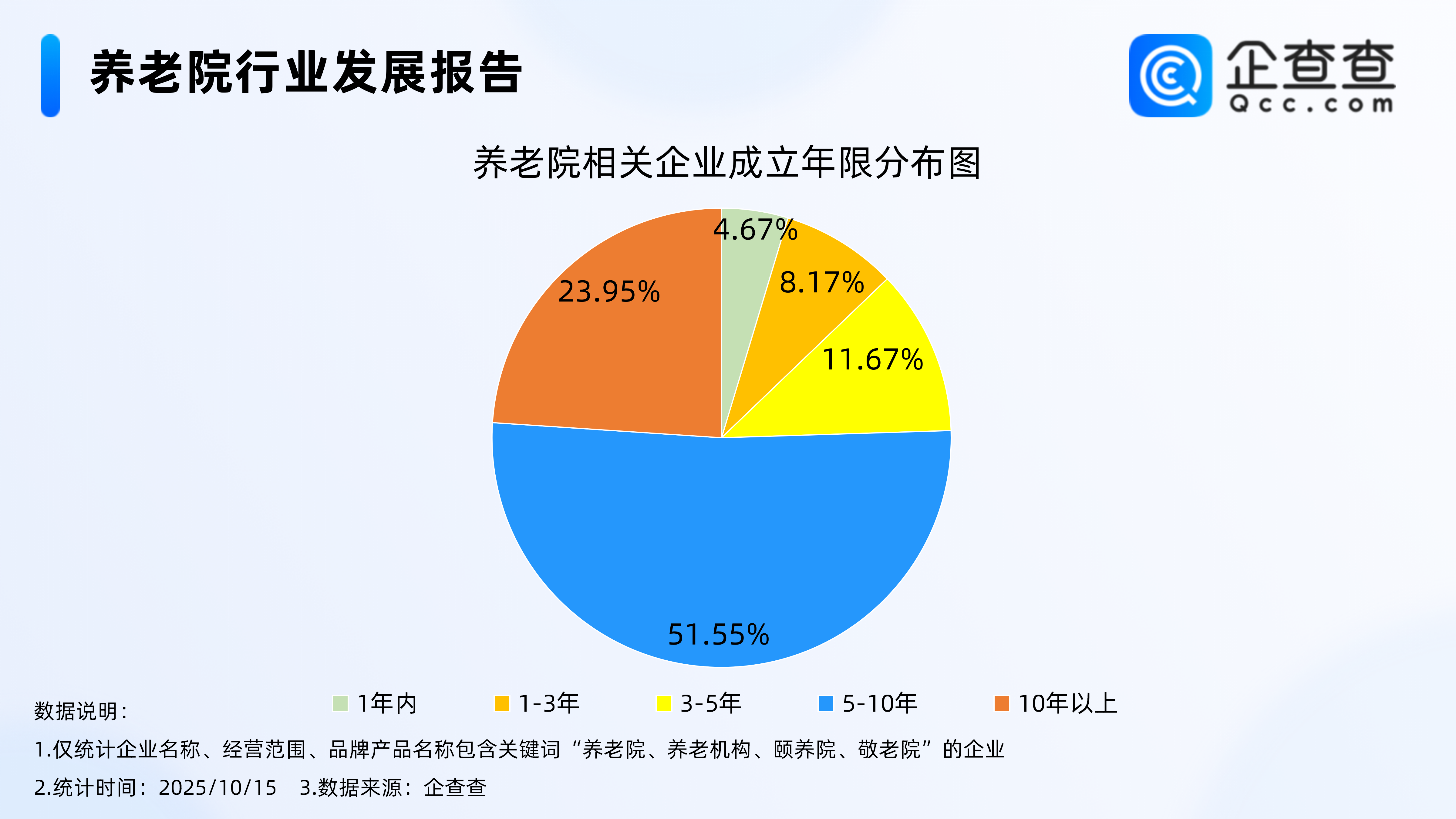 企查查数据显示,从经营时间来看,养老院相关现存企业多为老牌企业,超七成相关企业成立5年以上,其中成立年限在5-10年的相关企业最多,占比51.55%。成立年限在10年以上的相关企业占比23.95%。