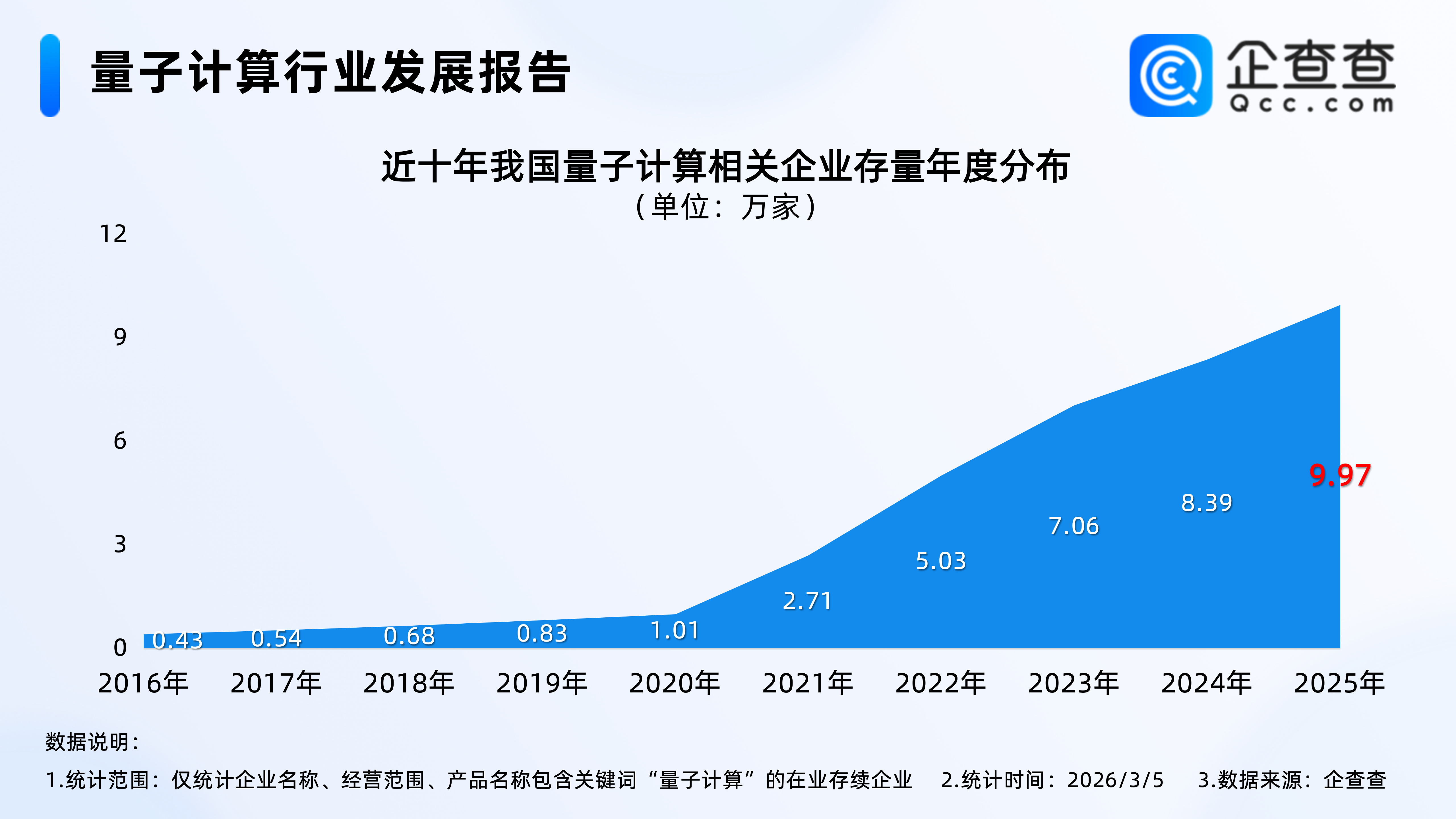 企查查数据显示,从企业存量来看,2021年成为我国量子计算相关企业存量增长的重要节点,此后相关企业存量实现逐年稳步攀升。2023年是相关企业存量增速最快的一年,全年企业存量新增2万余家,年末在业存续的量子计算相关企业达7.06万家;2024年年末存量增至8.39万家,2025年年末进一步升至9.97万家。截至2026年3月5日,我国在业存续的量子计算相关企业存量正式突破10万家,达10.17万家,行业发展规模迈上新台阶。