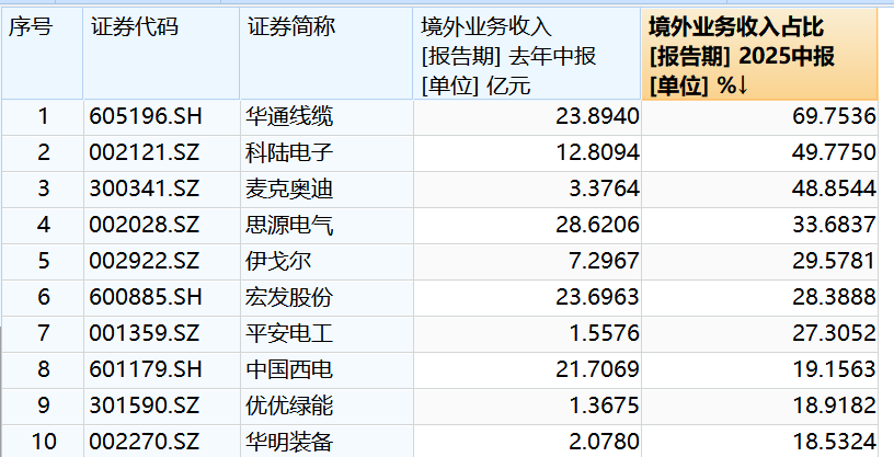 根据上市公司披露2025年中报数据,天弘中证电网设备主题指数基金(A类:025832 C类:025833)指数成分股中,有多家头部企业海外业务占比突出。其中,第二大成分股思源电气(权重占比11.44%),去年中报显示境外业务占比33.68%。