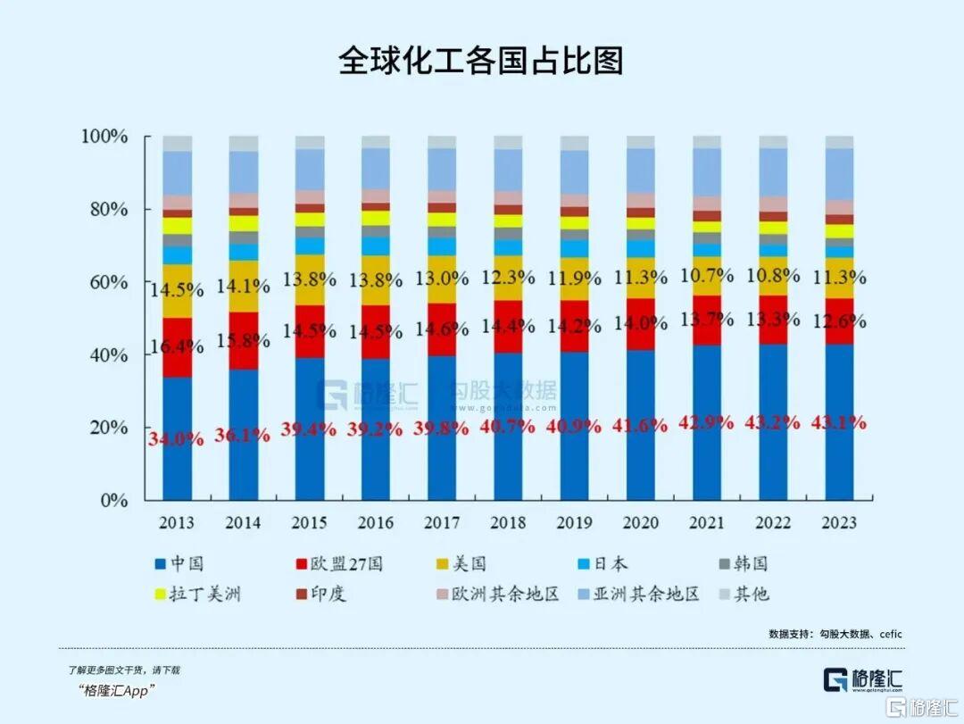 海外方面,中国化工品销售额已连续多年稳居全球第一,欧洲化工企业陆续退出下中国化工市占率有望进一步提升。据 CEFIC 数据,2023 年中国化工品销售额约 2.24 万亿欧元,占全球化工品销售总额的 43.1%,自 2013 年以来均稳居全球第一。