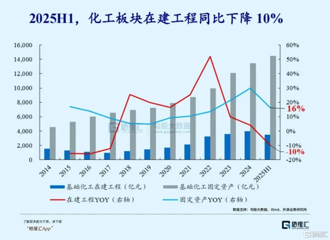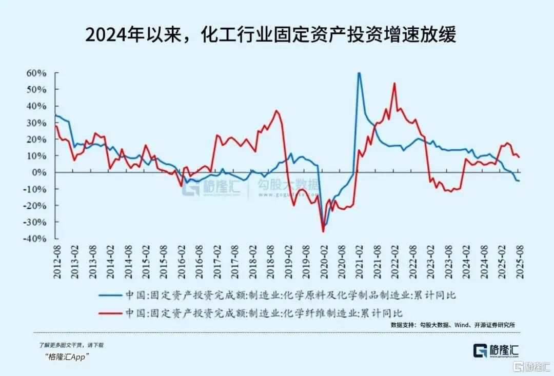 从资本开支来看,行业扩张高峰已过:2025年1-9月化学原料及化学制品制造业固定资产投资完成额同比减少5.6%,连续6个月保持负增长;基础化工上市公司上半年在建工程总额3979亿元,同比下降12.2%,较2023年峰值下降23%,资本开支二阶导转负,新增产能增速回落至7%左右,较2021-2022年双位数增速大幅下滑。