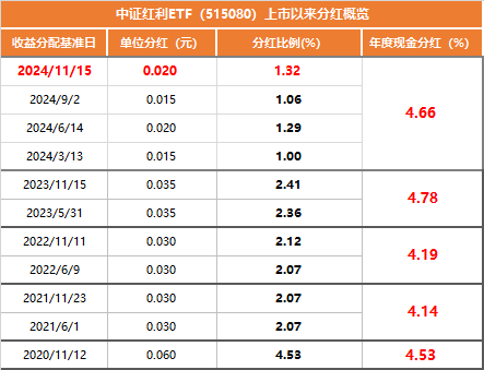 据了解,中证红利ETF(515080)于上周三发了第四季度分红公告,也是该ETF上市以来第11次分红。根据分红公告来看,加上今年前面三次的分红,中证红利ETF今年累计现金分红比例已经达到4.66%。
