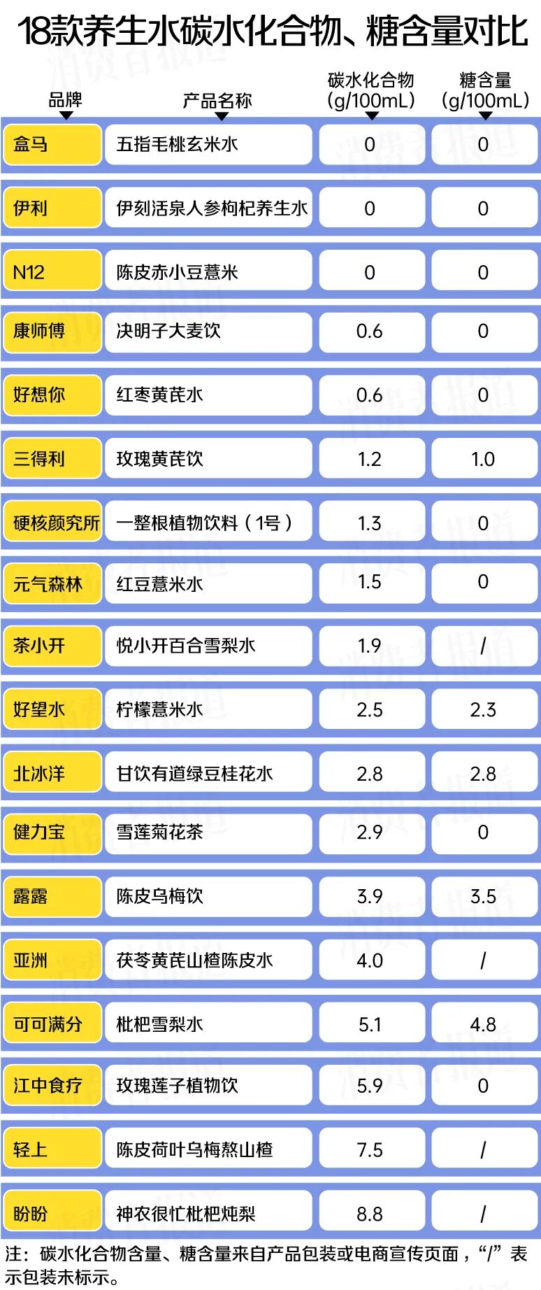 不过,养生水在控糖方面相对友好。在本次对比的18款产品中,盒马、伊利、N12、康师傅等9款产品的糖含量为0,其余多款产品也普遍达到了“低糖”标准(≤5g/100mL)。