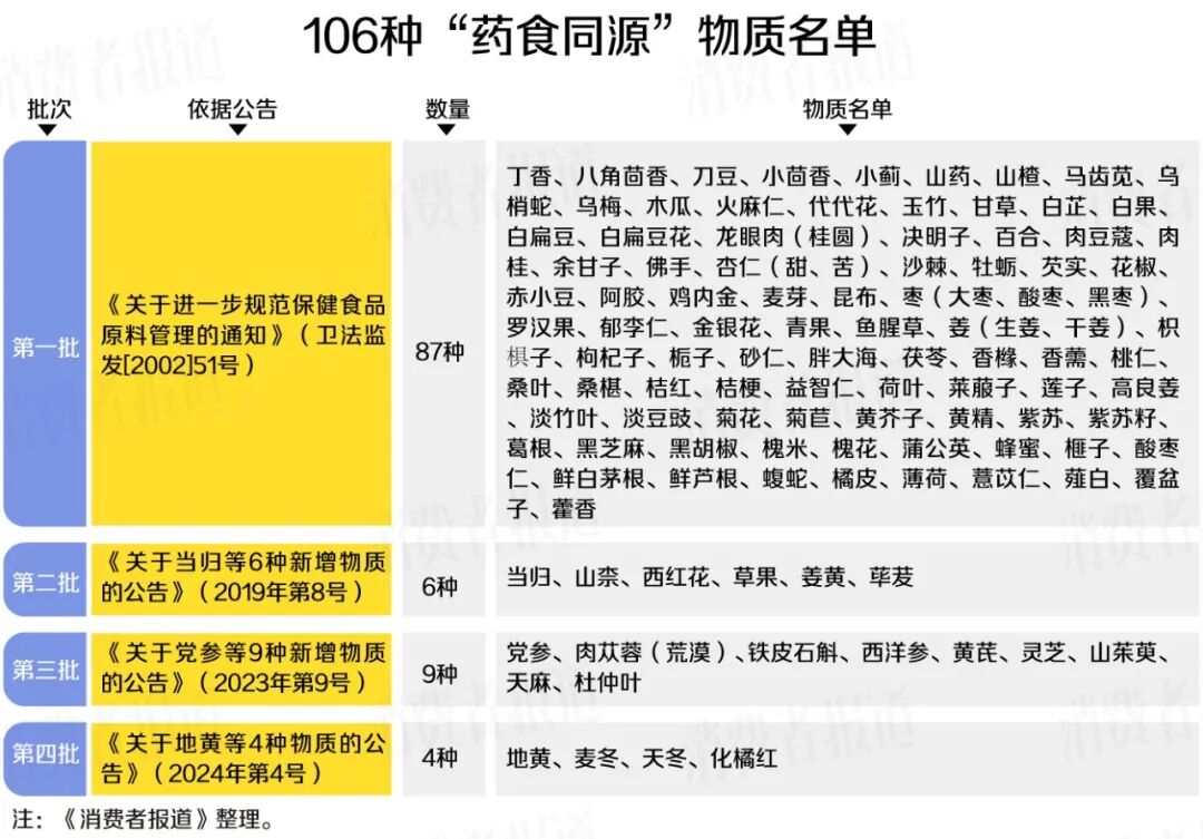 目前,国家已公布了106种“药食同源”物质,包括山楂、乌梅、枸杞、桂圆、菊花、桑叶、黄芪、当归等,这些也正是在各类养生水中频繁出现的“老面孔”。