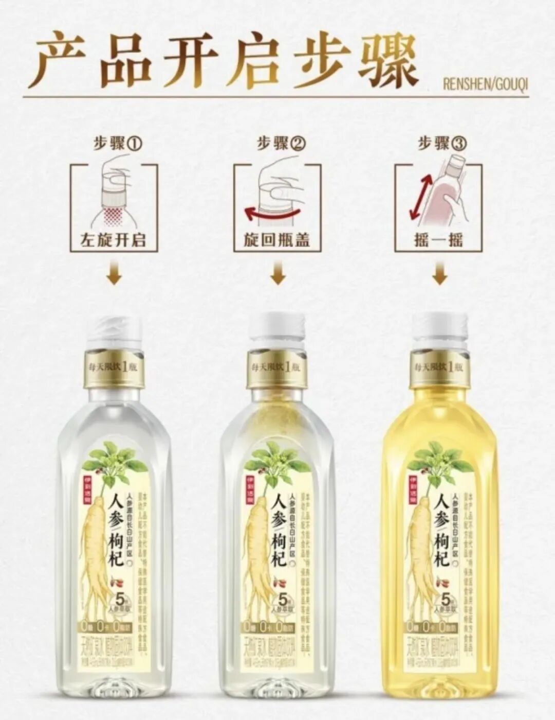 有趣的是,与一般即开即饮的植物饮料不同,伊刻活泉人参枸杞养生水包含了饮用天然矿泉水、植物固体饮料2种完全不同的产品类型。该款产品主打“现泡”模式,采用了专利的锁鲜盖技术,将人参冻干粉置于瓶盖中,饮用时通过“一拧一摇”的操作,使粉剂与瓶中的水混合,实现“现泡现喝”。