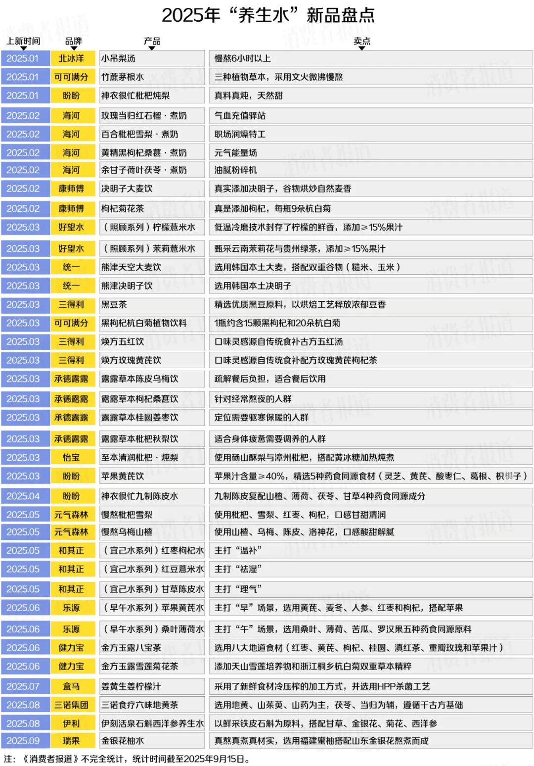2025年,各大品牌纷纷涌入养生赛道,加速“跑马圈地”。据《消费者报道》不完全统计,仅上半年就有超过30款新品上市,北冰洋、康师傅、统一、三得利、元气森林、怡宝等饮料品牌,以及盒马、伊利等也纷纷加码布局。
