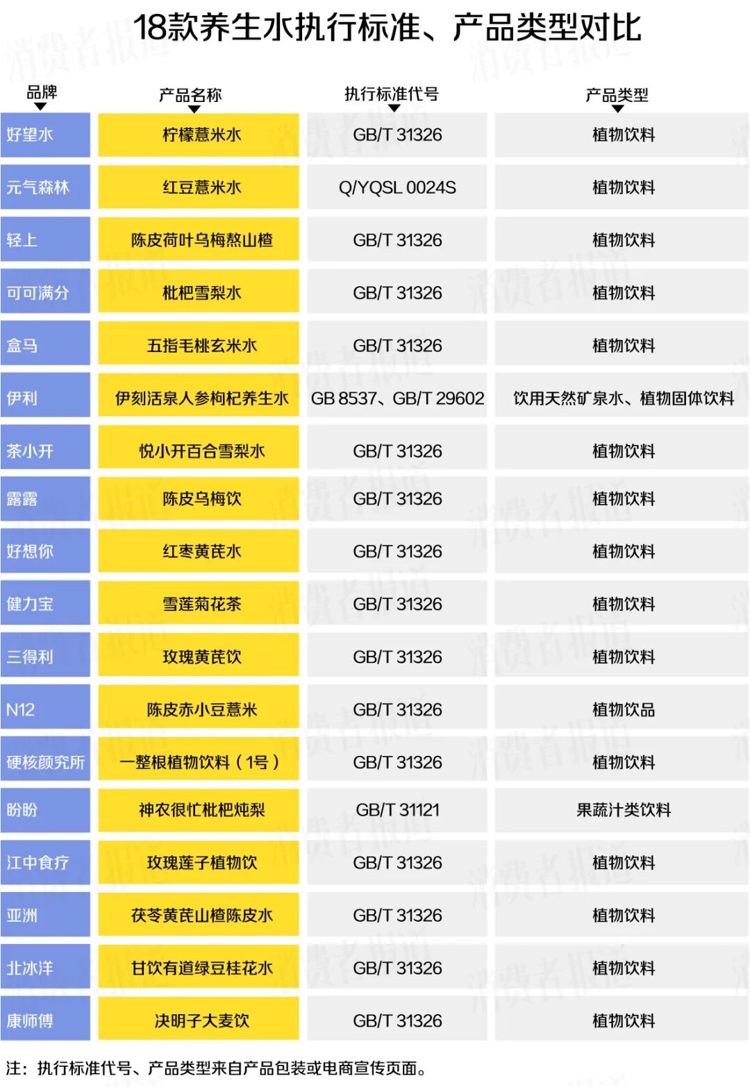 《消费者报道》对市面上主流的18款养生水进行了对比分析。从产品类型来看,这些产品大多属于“植物饮料”,其中16款执行标准为《植物饮料》(GB/T 31326—2014),元气森林执行企业标准Q/YQSL 0024S,盼盼旗下的“神农很忙枇杷炖梨”属于果蔬汁类饮料,执行标准为GB/T 31121—2014。