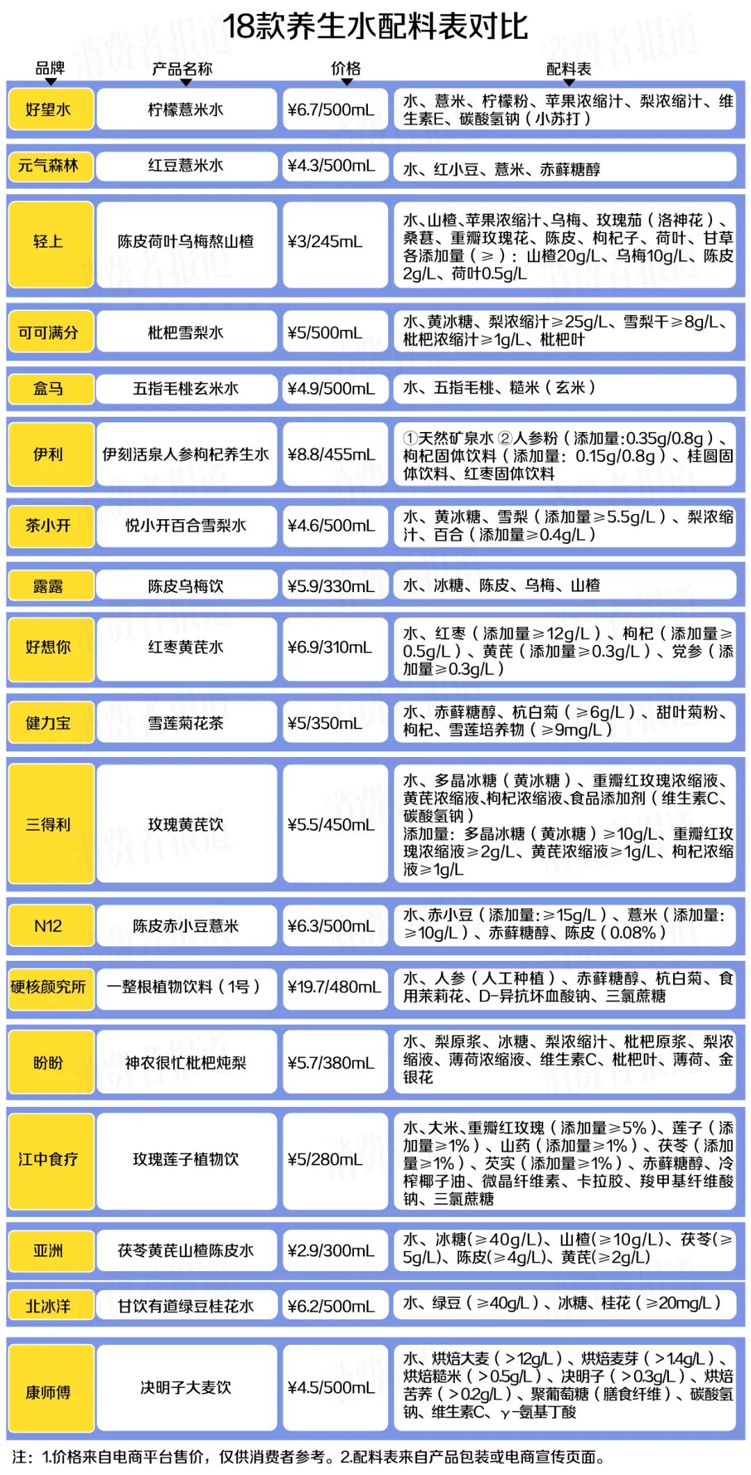“药食同源”的文化基因赋予了养生水天然的信任背书,但这些产品中究竟添加了多少养生食材?实际又能起到多少“养生”作用?
