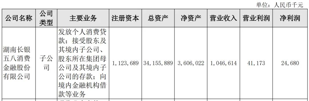 长沙银行控股长银五八消费金融,持有后者56.66%的股权。2025年上半年,长银五八消金实现营业收入10.47亿元,净利润0.25亿元。