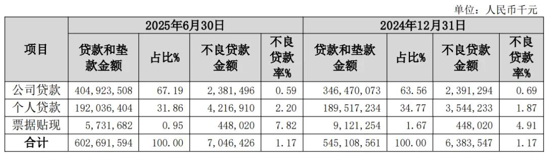 当然,这种扩张也不是没有代价:2025年上半年,长沙银行个贷平均利率4.88%,同比下滑15.42%;个贷利息收入45.41亿元,同比下滑15.12%;而截至2025年6月末,该行个贷不良金额42.17亿元,较上年末增长18.99%,不良率2.20%,较上年末上升了0.33个百分点。