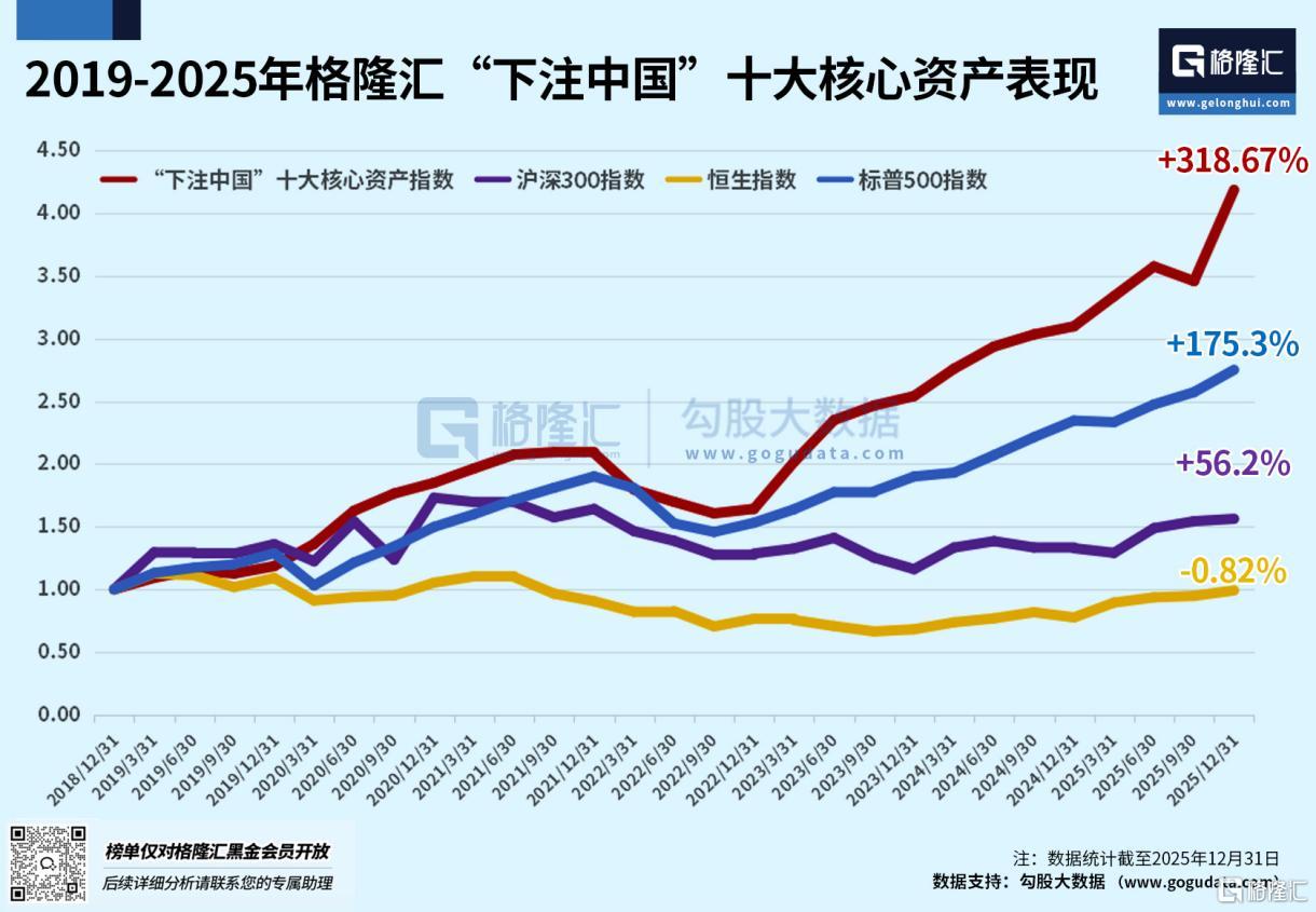 2019-2025年期间,格隆汇“下注中国”十大核心资产指数累计涨幅达318.67%,大幅跑赢同期沪深300指数(+56.2%)、恒生指数(-0.82%),即便对标全球市场的标普500指数(+175.3%)也更具优势;