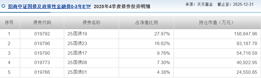 从产品底层看,国债政金债ETF招商(511580)跟踪的是一篮子国债和政策性金融债,属于典型的利率债组合。根据最新披露的持仓数据,其前五大持仓均为剩余期限在5年左右的国债,合计占基金资产净值比例超过66%。这类资产的信用背书无需赘言,核心风险敞口仅在于利率波动。而在当前宏观预期下——外部地缘风险缓释,内部宽货币预期仍在——利率债的方向相对清晰。