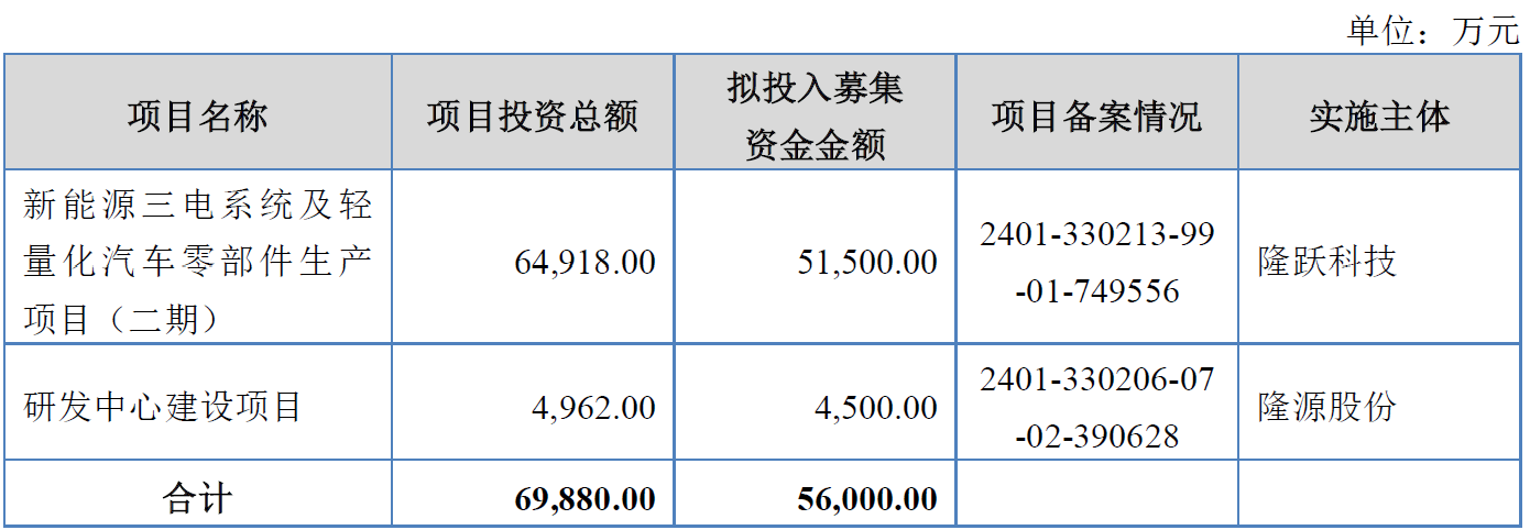 基于对于行业趋势与前景的研判,隆源股份此次冲刺北交所拟募集资金5.60亿元,主要投向“新能源三电系统及轻量化汽车零部件生产项目(二期)”及研发中心建设。该募投项目直指汽车新能源化与轻量化发展机遇,旨在进一步扩大公司在新能源汽车核心零部件领域的产能规模,优化产品结构,满足下游客户日益增长的需求。而研发中心建设项目,将围绕解决“材料-模具-工艺-产品”等技术痛点展开,提升公司产品在汽车行业关键领域的竞争力。