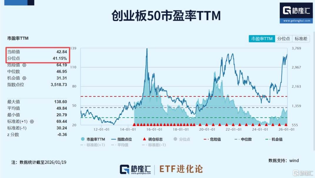 从估值维度观察,创业板50在经历前期调整后,整体估值已回到相对理性区间。当前PE-TTM为42.84倍,水平处于上市以来中位数以下位置,反映出市场对成长资产的定价正在趋于平衡。