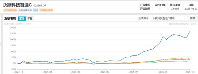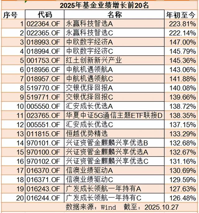 Wind数据显示,截至2025.10.27,年初至今基金涨幅TOP20中,几乎是清一色的科技主题基金。其中,永赢科技智选、中欧数字经济、红土创新新兴产业、中航机遇领航、交银优择回报等名列前茅。