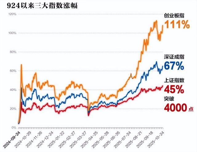 本轮牛市的起点,无疑是去年的9.24行情。从那时起到今天,这轮牛市已经运行1年零1个月。期间,上证指数上涨45%,深成指上涨67%,创业板指上涨111%,科创50指数上涨131%。