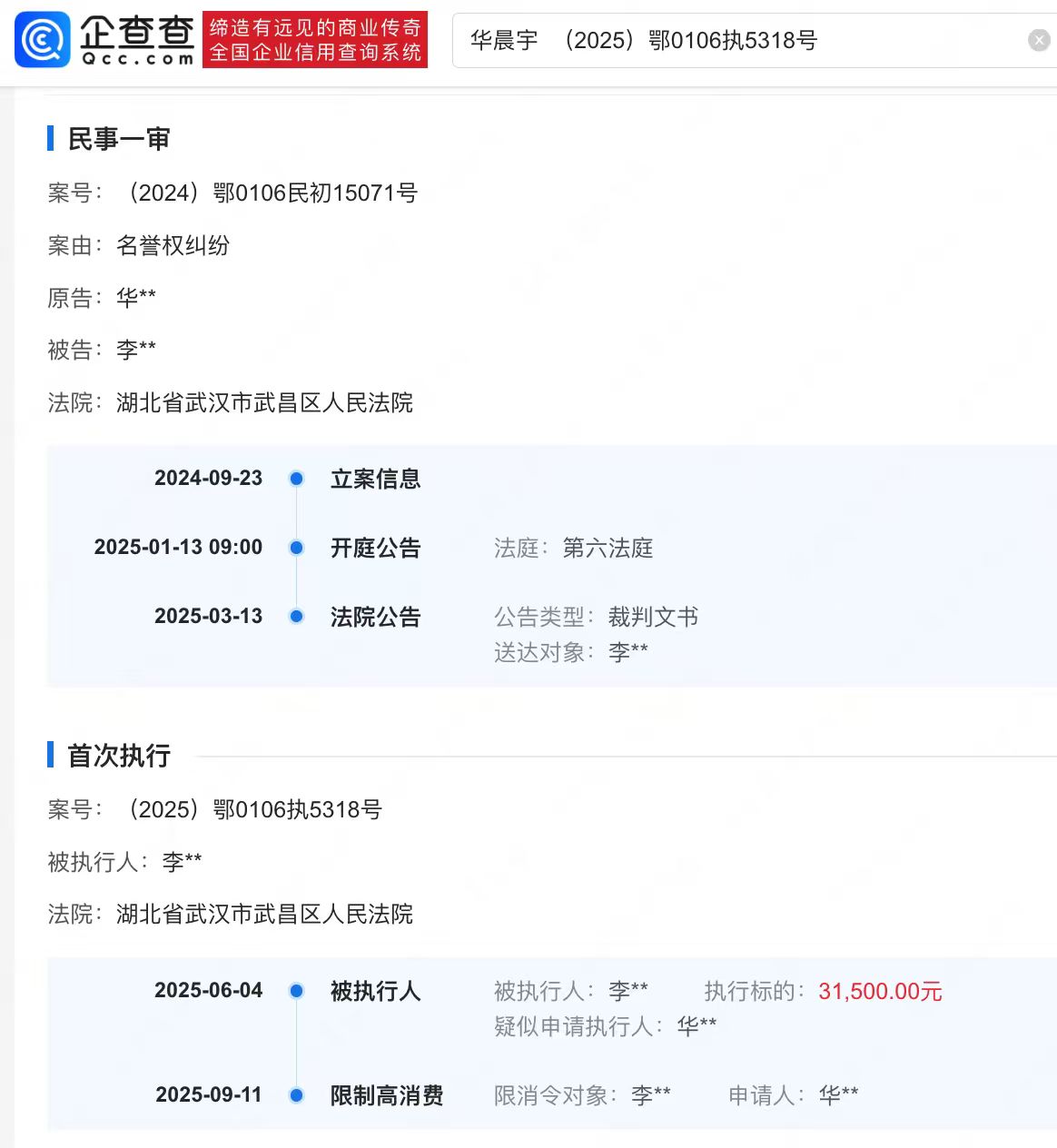 企查查APP显示,近日,华晨宇与李某某人格权纠纷新增限制消费令,因李某某未在指定期间履行给付义务,法院对其采取限制消费措施。此前华晨宇工作室晒判决书,被告被判在账号上置顶刊登致歉声明(时间不少于一个月等),赔偿华晨宇律师费 3万元,今年6月被告已被强制执行。