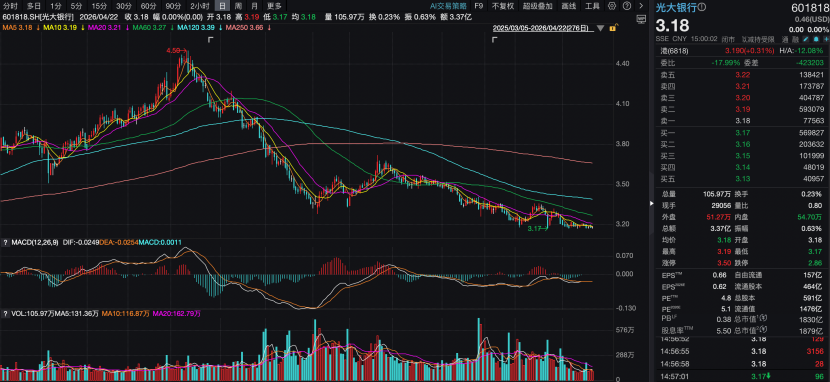 截至4月22日收盘,光大银行报收于3.18元/股,较2025年的高点已下挫29.33%,PB为0.38倍,PE为4.8倍,市值为1830亿元。