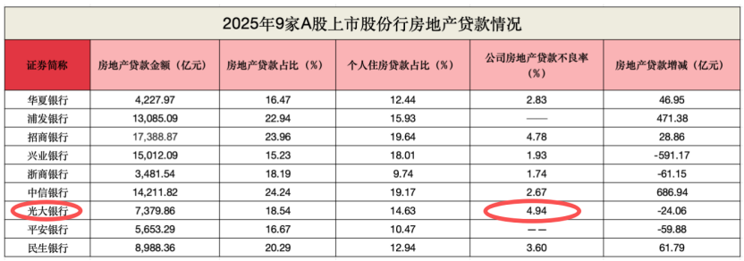 值得一提的是,光大银行的公司房地产贷款不良率在9家股份行排名第一。