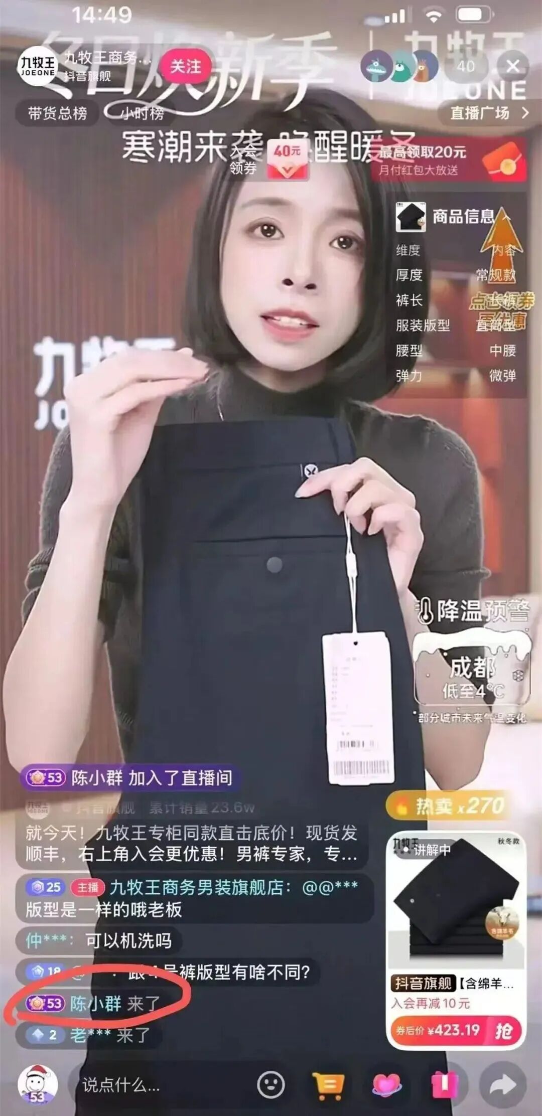 同日中午,疑似其本人账号曾进入九牧王的抖音直播间。随后,他就出现在了当日的龙虎榜上。
