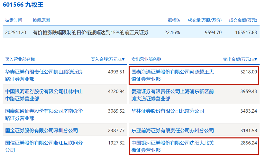 其中,国泰海通证券河源越王大道证券营业部席位,以及通常代表陈小群的中国银河证券沈阳大北关街证券营业部席位,分别卖出5218.09万元和2856.24万元。