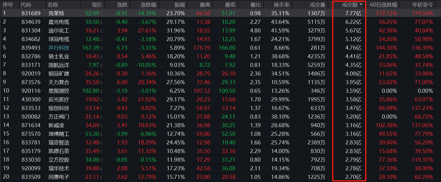 成交额前五的是,克莱特(831689)成交7.77亿元,晨光电缆(834639)成交6.22亿元,迪尔化工(831304)成交5.67亿元,球冠电缆(834682)成交5.12亿元,并行科技(839493)成交4.76亿元。市场资金活跃度较高,多只个股成交额较为突出。
