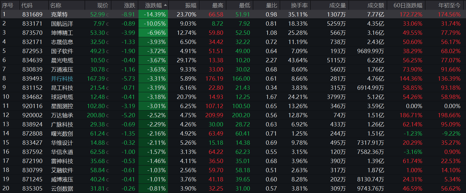 跌幅前五的是,克莱特(831689)跌14.39%,国航远洋(833171)跌10.05%,坤博精工(873570)跌6.96%,志晟信息(832171)跌3.93%,国子软件(872953)跌3.72%。