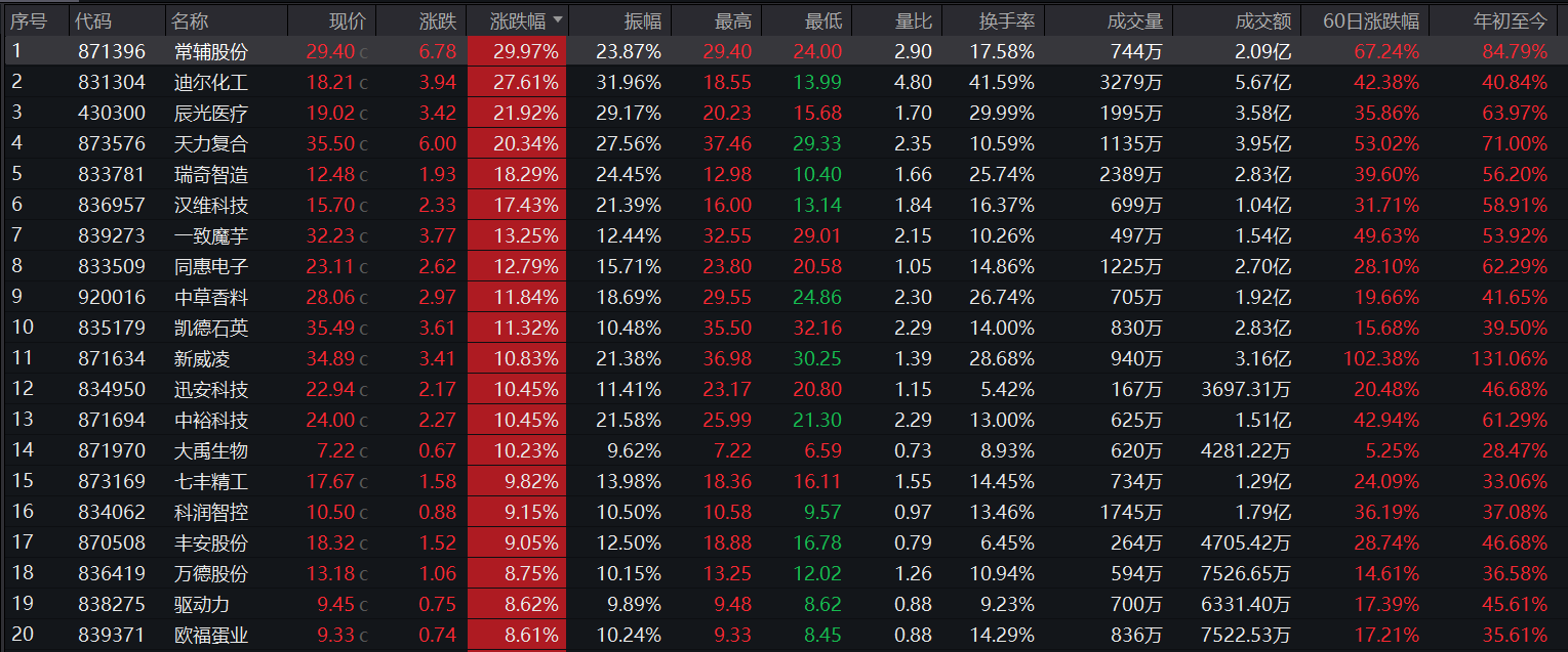涨幅前五的是,常辅股份(871396)开盘跳高、迅速30CM涨停,迪尔化工(831304)涨27.61%,辰光医疗(430300)涨21.92%,天力复合(873576)涨20.34%,瑞奇智造(833781)涨18.29%。。