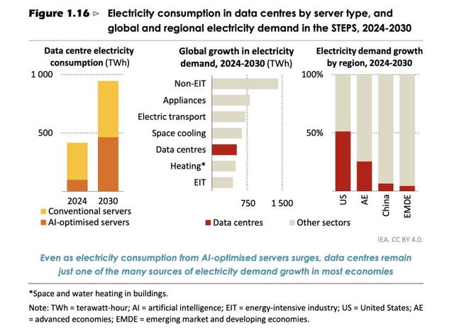 在报告中,IEA预计到2035年,数据中心的用电量将增加三倍,但这仅占全球电力需求增长的不到10%,且这种增长高度集中在特定地区。