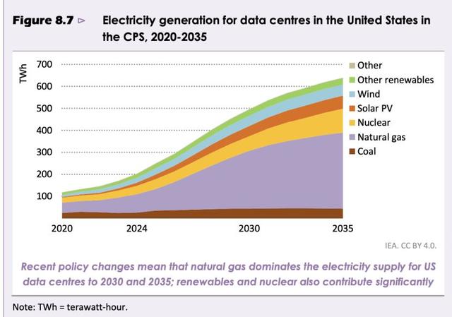 到2035年,预计天然气将提供美国数据中心所需电力的一半以上;可再生能源和核能各约占20%;煤电约占7%。